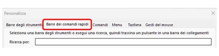 Per poter sfruttare al meglio le barre dei comandi rapidi, conviene personalizzarle in funzione delle esigenze. Un modo per personalizzarle è quello di entrare in modalità di personalizzazione (come indicato nel precedente paragrafo), selezionare “barre dei comandi rapidi” e trascinare i comandi voluti nella barra da personalizzare.