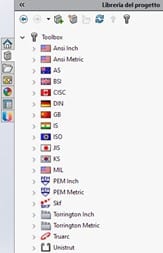 La libreria Toolbox è completamente integrata nell’interfaccia di SolidWorks ed una volta attivata nelle aggiunte, la troverai nel Task Pane, all’interno della Libreria del Progetto assieme alle altre librerie personalizzate. Gli standard supportati includono: ANSI, BSI, DIN, ISO, JIS, GB, Skf, etc.. e sono configurabili a tuo piacimento, in funzione del settore e delle necessità.