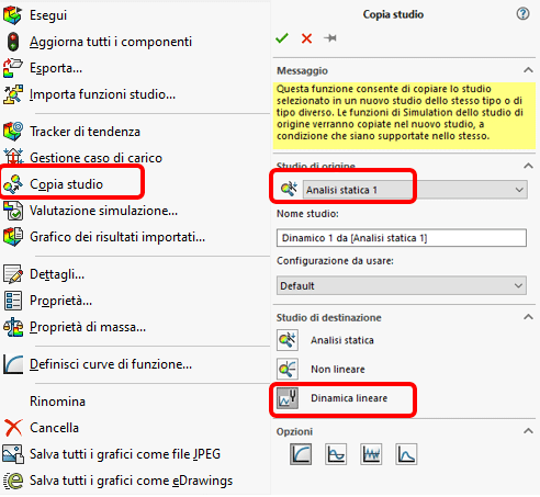 In SolidWorks Simulation, ad esempio, questo processo viene facilitato dal “Copia studio”, funzionalità con cui è possibile selezionare lo studio statico ed importarlo in un nuovo studio dinamico, recuperando velocemente tutte le impostazioni già definite e risparmiando tempo prezioso.
