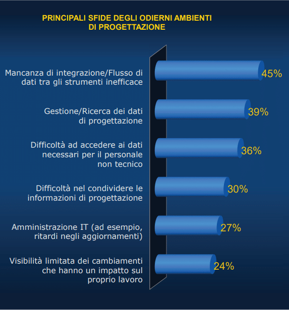Capiamo quindi che limitare il discorso ad una questione meramente ingegneristica sarebbe controproducente: i requisiti di un development plan che si rispetti coinvolge molti più attori, spesso anche esterni all’azienda. Nel suddetto documento è emerso che le principali sfide affrontate dagli odierni ambienti di progettazione sono, in larga parte, legate alla collaborazione.