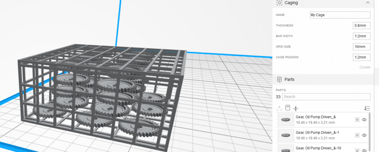 Una caratteristica speciale di Smartstream è l’opzione Caging. Questo mi permette di creare una gabbia intorno alle mie piccole parti in modo che non si perdano durante il processo di pulizia. Qui sotto, vedete 32 ingranaggi e i parametri di ingabbiamento che ho usato sul lato destro.