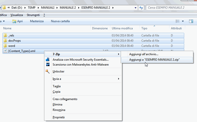Andare nella cartella “D:\TEMP\MANUALI\MANUALE 2\ESEMPIO MANUALE 2” e, dopo aver selezionato TUTTO il contenuto, creare un nuovo ZIP che abbia lo stesso nome della cartella padre (e quindi del file DOCX, in questo caso “ESEMPIO MANUALE 2”):