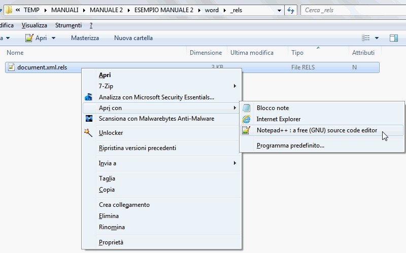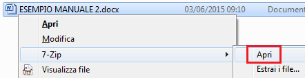 Con 7-Zip si scompatti il nuovo file Manuale 2, con l’attenzione di farlo in una cartella con lo stesso nome (senza estensione) del file *.DOCX: