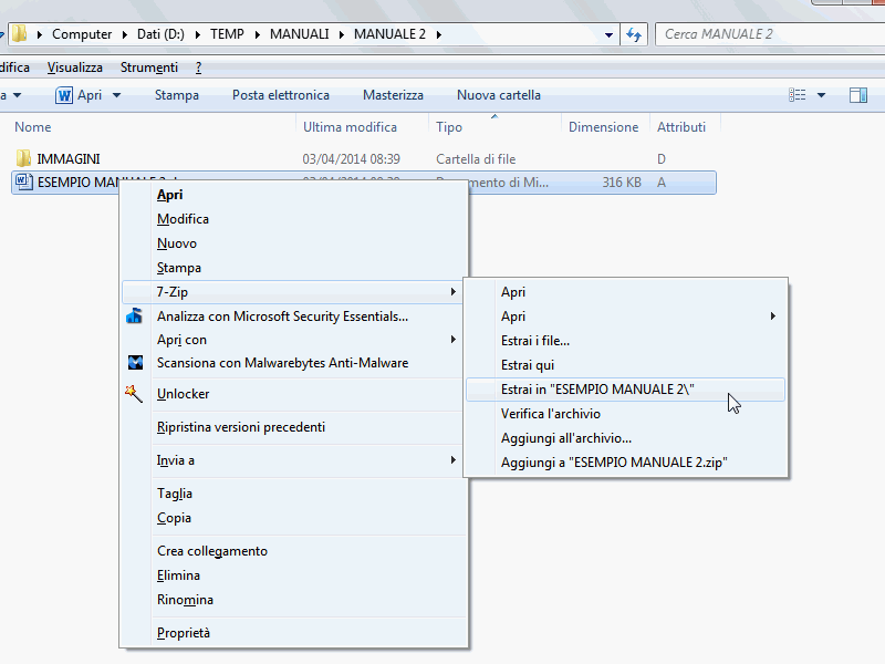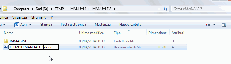 Rinominare “ESEMPIO MANUALE 2.ZIP” in “ESEMPIO MANUALE 2.DOCX” e metterlo nella cartella superiore (D:\TEMP\MANUALI\MANUALE 2).