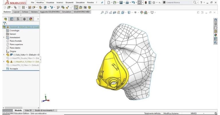 “Lavorando con superfici di basso spessore, la modellazione con SolidWorks per superfici che vengono inspessite o per solidi che vengono svuotati sono sicuramente dei vantaggi che hanno consentito di variare lo spessore dei singoli labbri e della singola struttura della mascherina per alleggerirla o renderla più malleabile sul viso”.