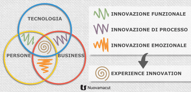 Lo schema qui sopra illustra gli aspetti fondamentali per un approccio realmente innovativo e globale allo sviluppo prodotto. Si basa sulla considerazione simultanea di tre elementi: Tecnologia, Business e Persone. Soltanto “mettendo a fattore comune” tali elementi è possibile ottenere quella che viene definita Experience Innovation.