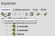 La Modalità di selezione Assiemi può selezionare solo assiemi: se un nodo di geometria (ossia una parte) viene cliccato, la selezione passa al padre immediatamente superiore.
