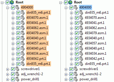 Quindi un click su un sottoassieme, quando lo evidenzia in arancio, non seleziona affatto quell’assieme ma tutte le parti di ultimo livello comprese sotto quel nodo di gerarchia.