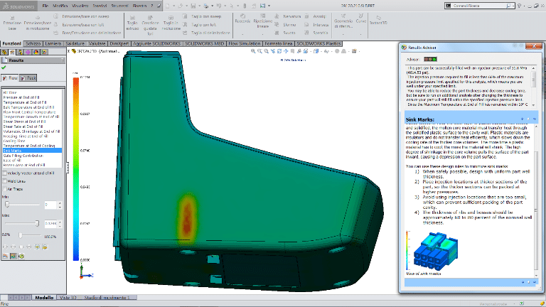 Come puoi notare SOLIDWORKS Plastics ha perfettamente previsto il punto in cui si è manifestata in modo visibile una depressione o cedimento.