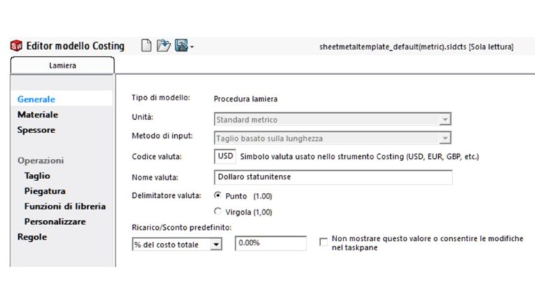 Le informazioni sulla produzione e sul materiale dei modelli vengono utilizzate dall’applicazione Costing per determinare il costo di fabbricazione. Nei modelli è possibile specificare il materiale utilizzato per creare una parte, il suo processo di fabbricazione (come ad esempio taglio laser, piegatura o fresatura), il metodo di fabbricazione scelto (lavorazione a macchina, fusione, stampa in plastica e stampa in 3D) e i costi associati ai materiali e alle operazioni di produzione. Il modello consente inoltre di creare operazioni personalizzate come confezionamento, ERP entry, rivestitura o pulizia.